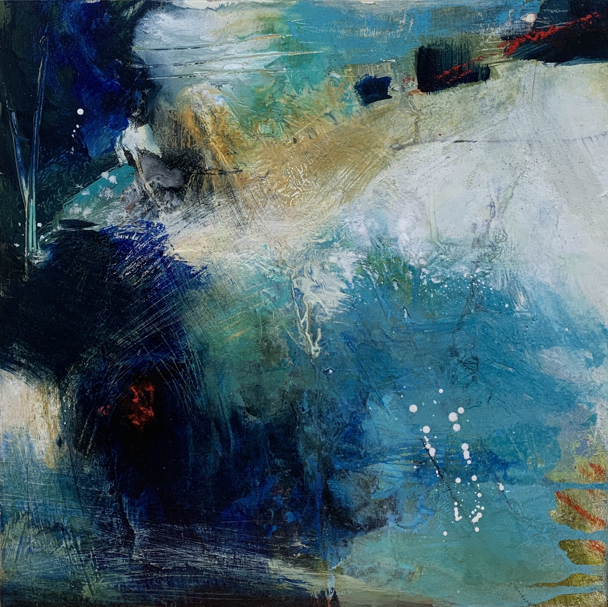 This small mixed media painting has a tremendous amount of movement underneath and on the surface of the panel, like the roiling waves that break the surface of a quiet sea. It is floating in a simple white wooden frame. Available through Artsy.