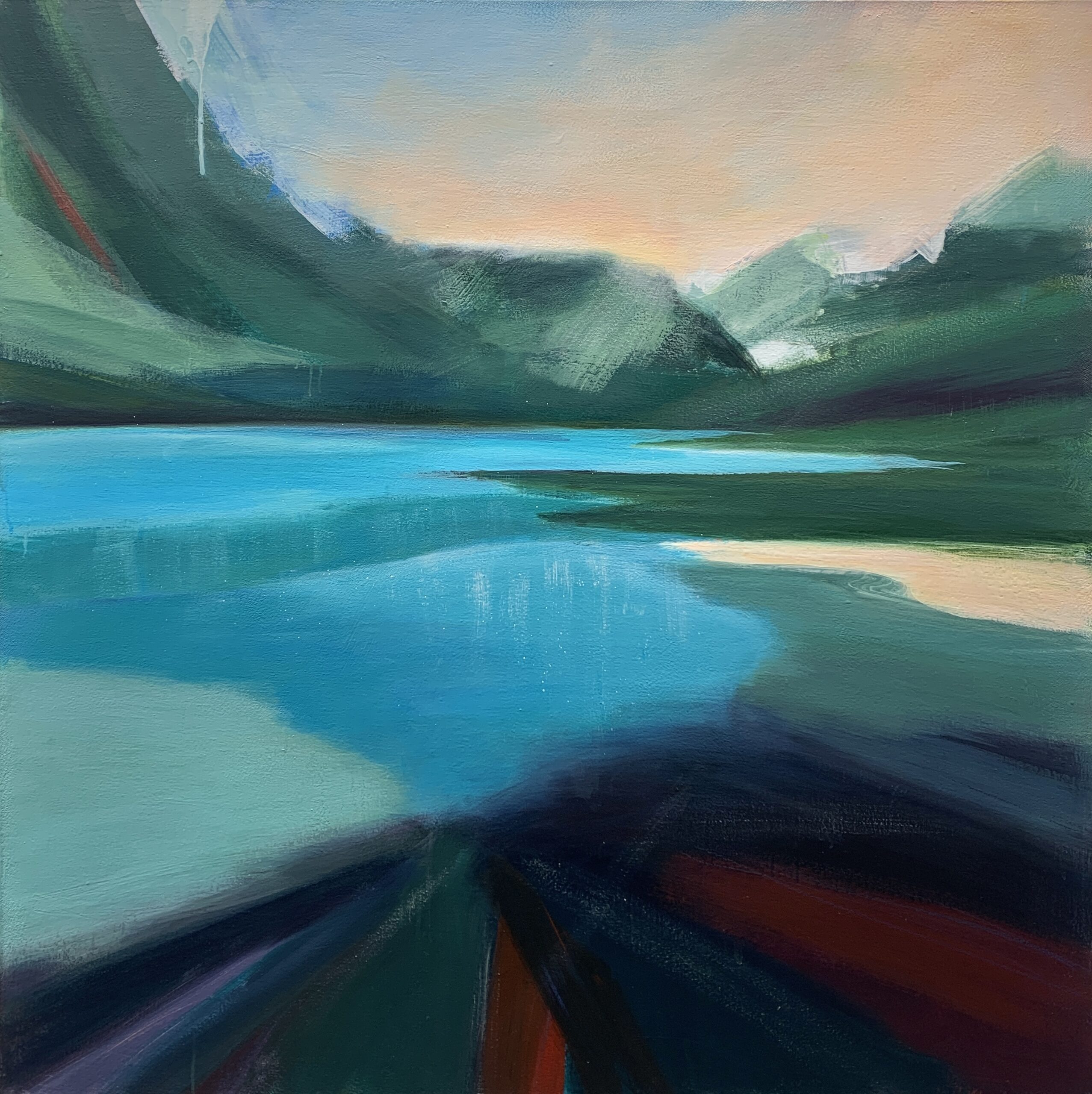 During a hiking trip in the Canadian Rockies, we came upon turquoise lakes that burst into a thousand bits of light under a blustery sky. I couldn't stop thinking that everything was dressed in sequins. This painting is 40x40, mixed media on canvas. It will be available through the Museum of Northern California Art from May 16-July 7.