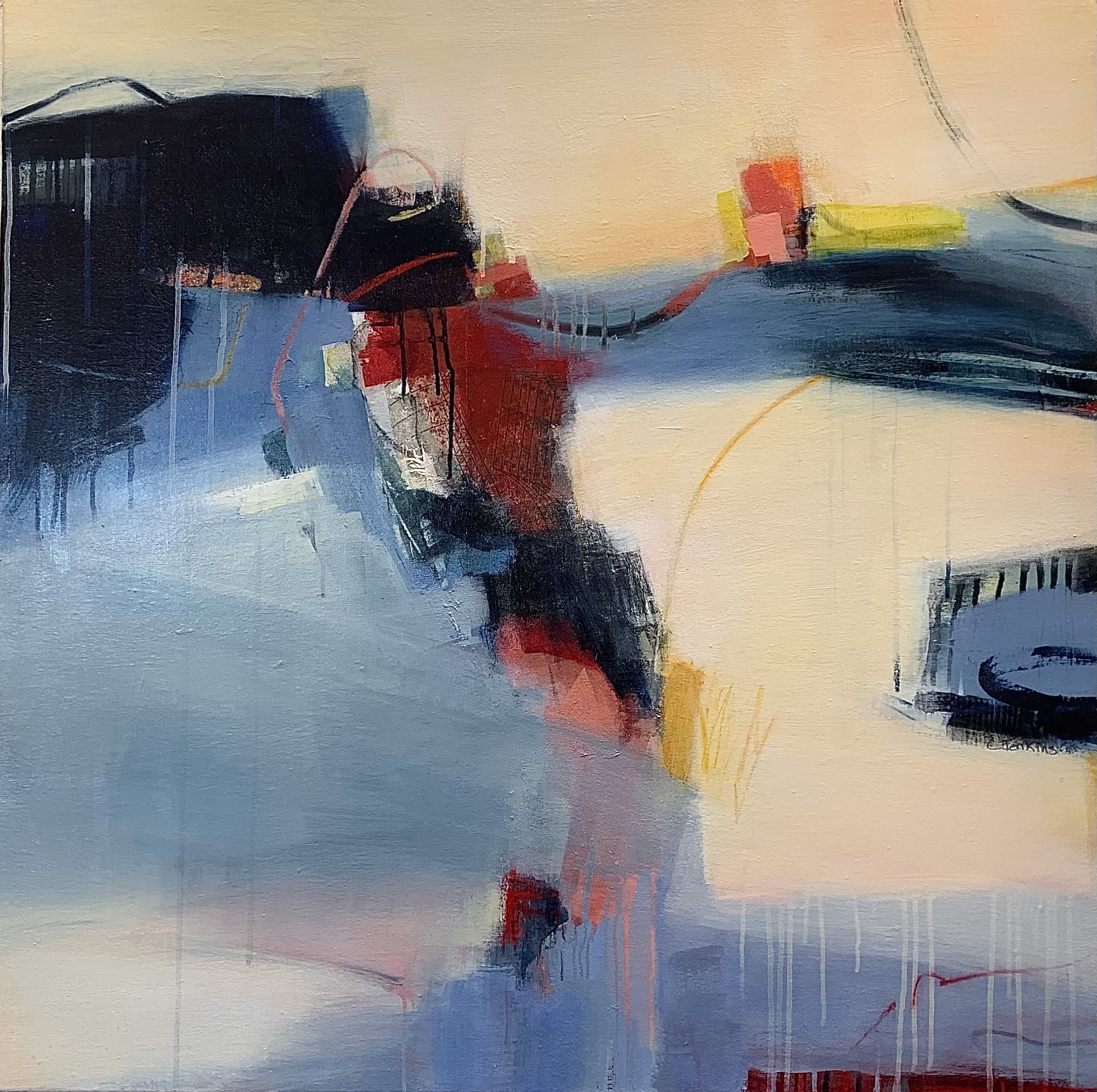 This 36x36 mixed media painting on canvas has sweeping open spaces as well as delicate detailed areas that call to mind birds flying through an open sky. Birds often symbolize freedom and renewal. This painting is an ode to joy and hope.