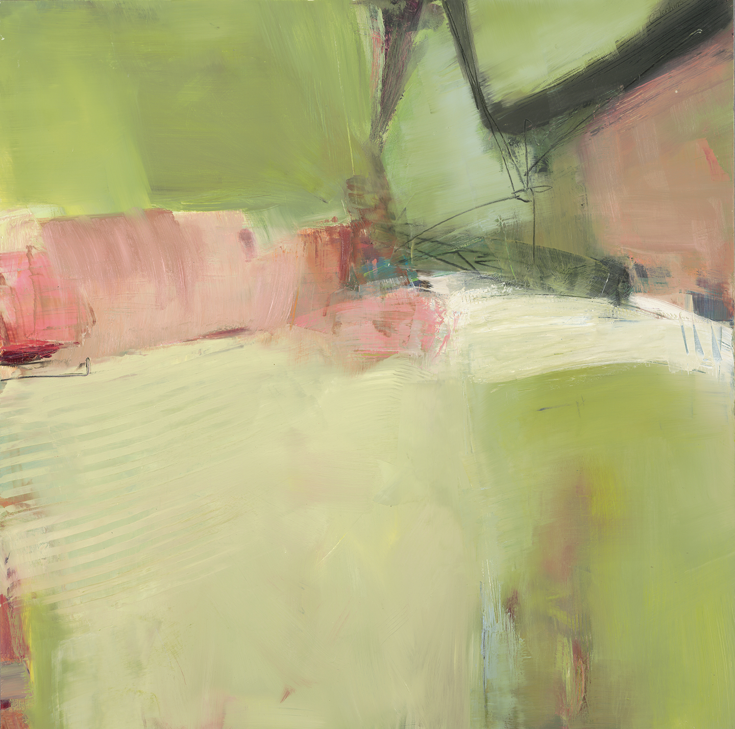 The delicacy of the pinks and greens in this oil painting, along with the strong gestural marks are like that first bloom in spring: quiet, yet exciting. This painting is 24x24 oil paint on cradled panel, sealed and varnished.
