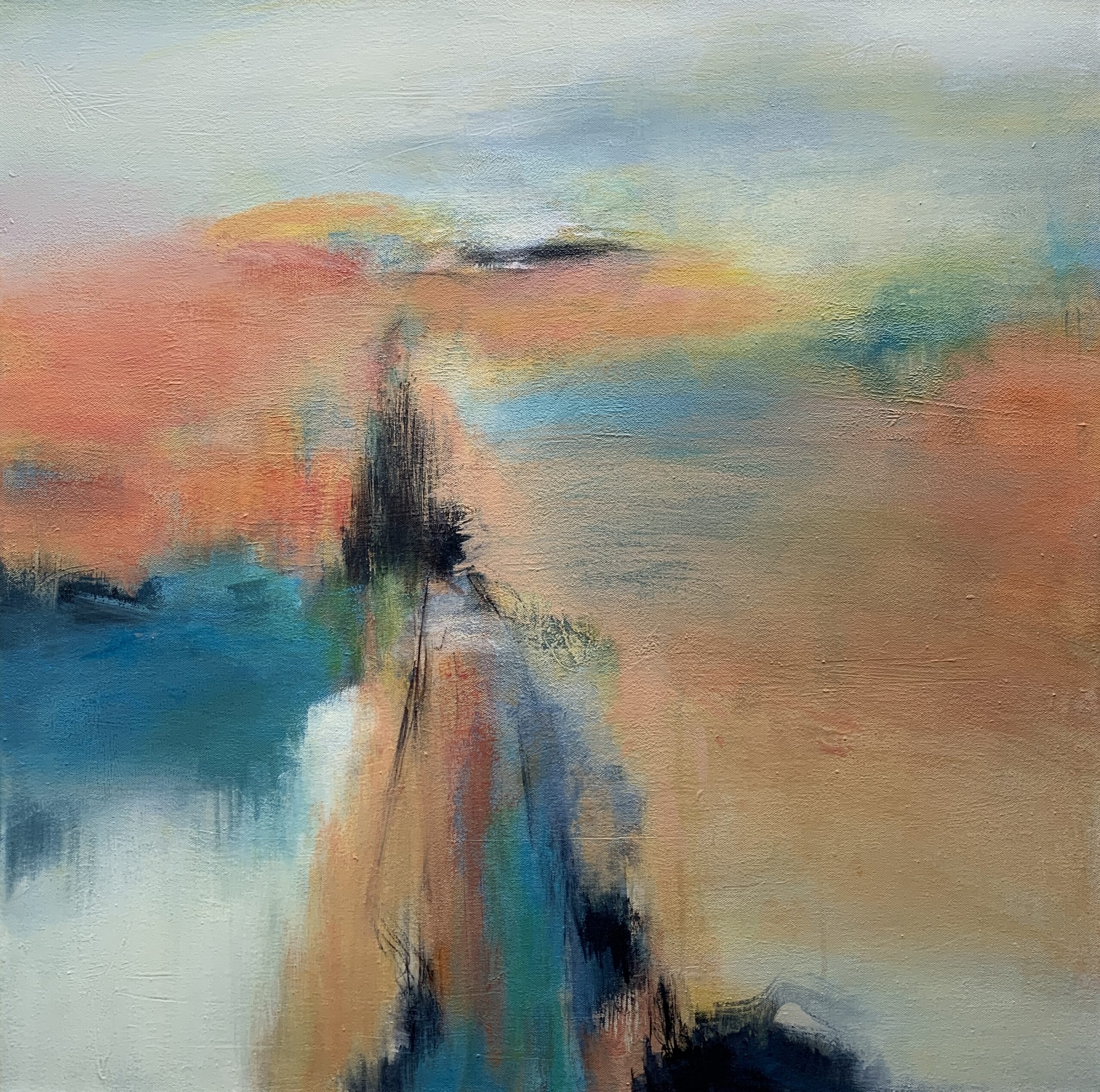 This painting was inspired by a river trip down the Grand Canyon. The cliffs on either side of the rushing Colorado River were marble in one area: pink, rose and rust-orange rock striated by dark ebony veins. The colors were stunning!