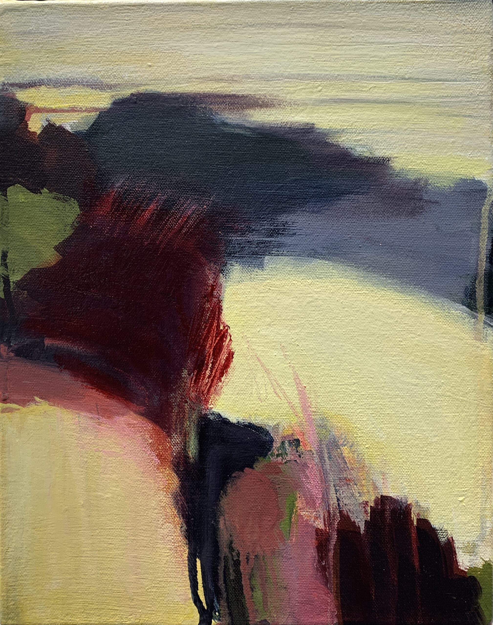 The deepening blue and crimson against a yellow background reminded me of a landscape lit by golden moonlight. This painting floats in an elegant off-white wooden frame.