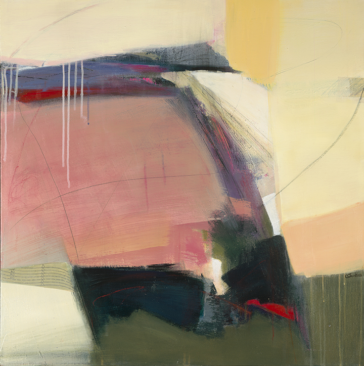This painting was finished shortly after a week-long meditation retreat. The movement of the shapes, the quiet dynamism of the painting reminds me of the sound of a meditation gong and our early morning chants.