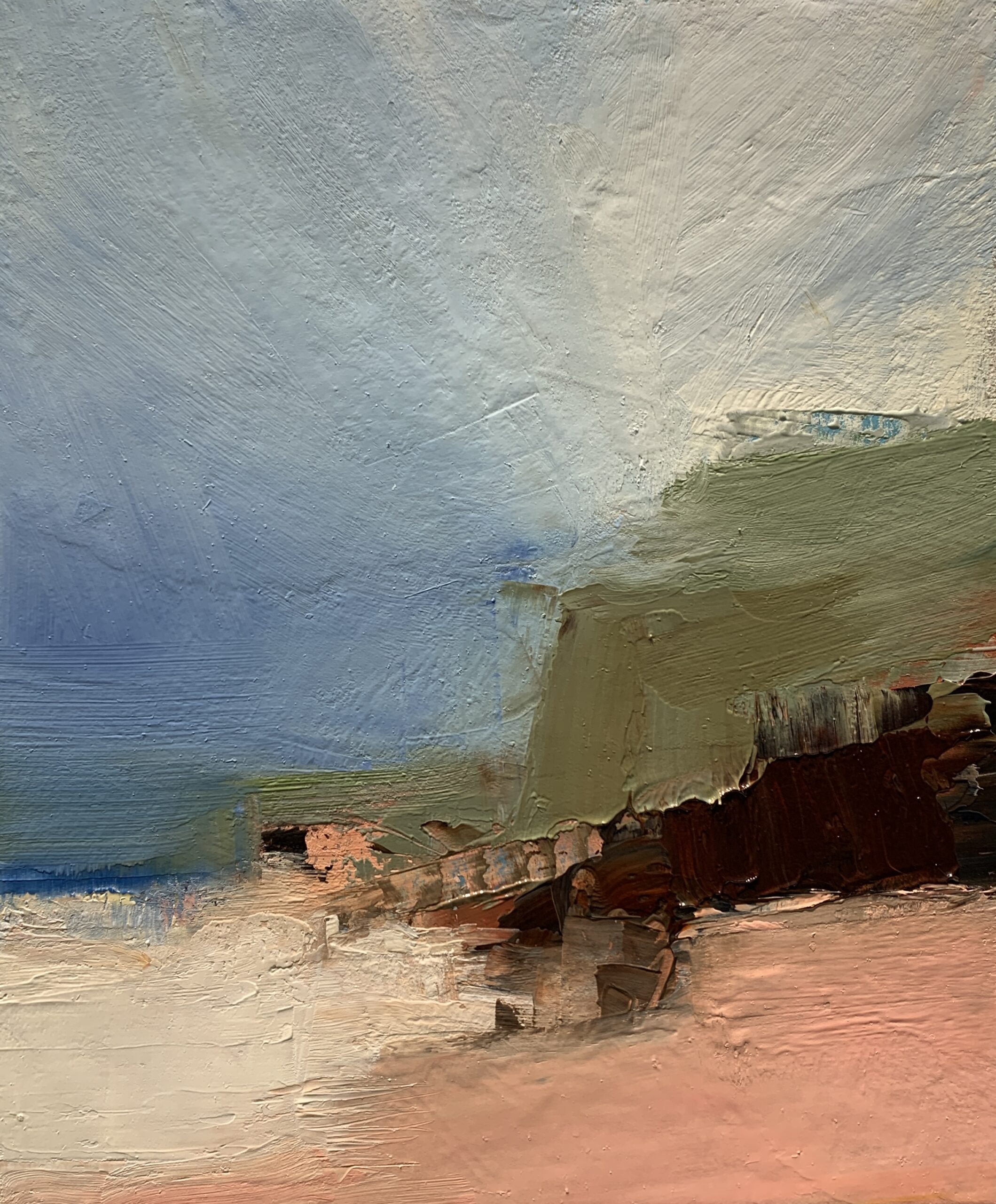 The colors in this small abstract landscape were inspired by a recent trip to Morocco, with its olive tree greens and clay tinged pinks and browns. It works well with Morocco 2! Oil paint on cradled panel.