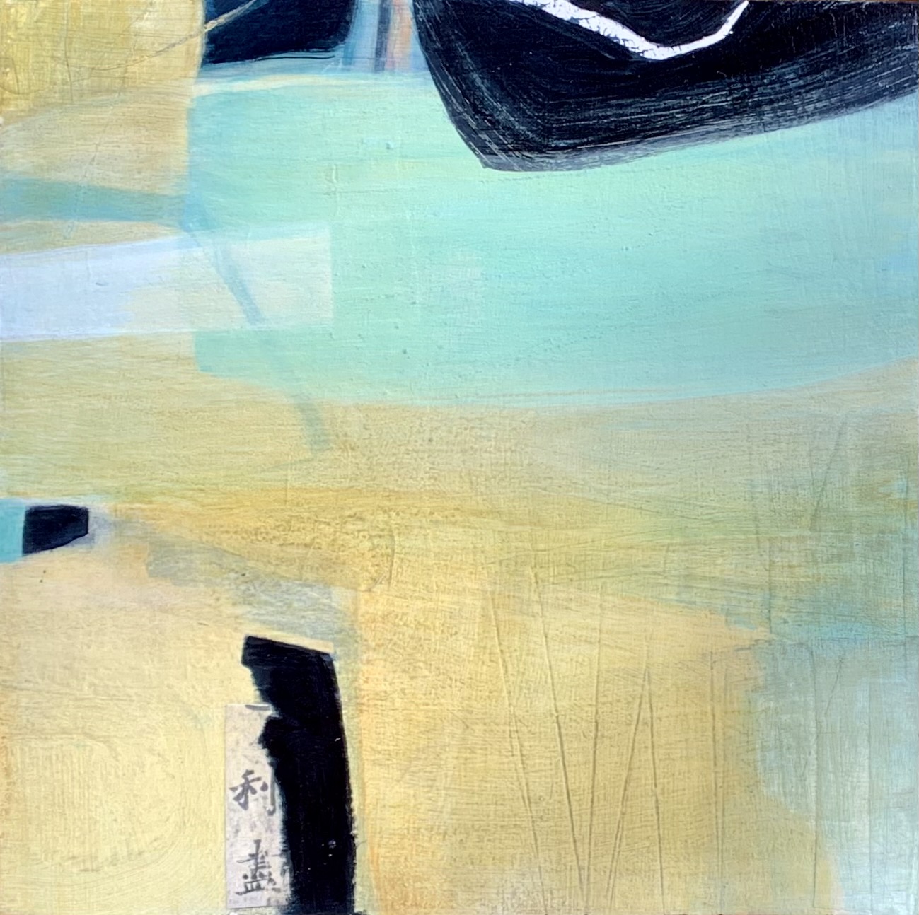 This framed 12x12 mixed media painting is painted with tawny sand colors and a turquoise blue that immediately reminded me of an oasis: a place to quench the thirst during a barren place or time. The bits of calligraphy used as collage pieces evoke the idea that there is also a quenching of spiritual thirst. All proceeds will be donated to Doctors Without Borders.