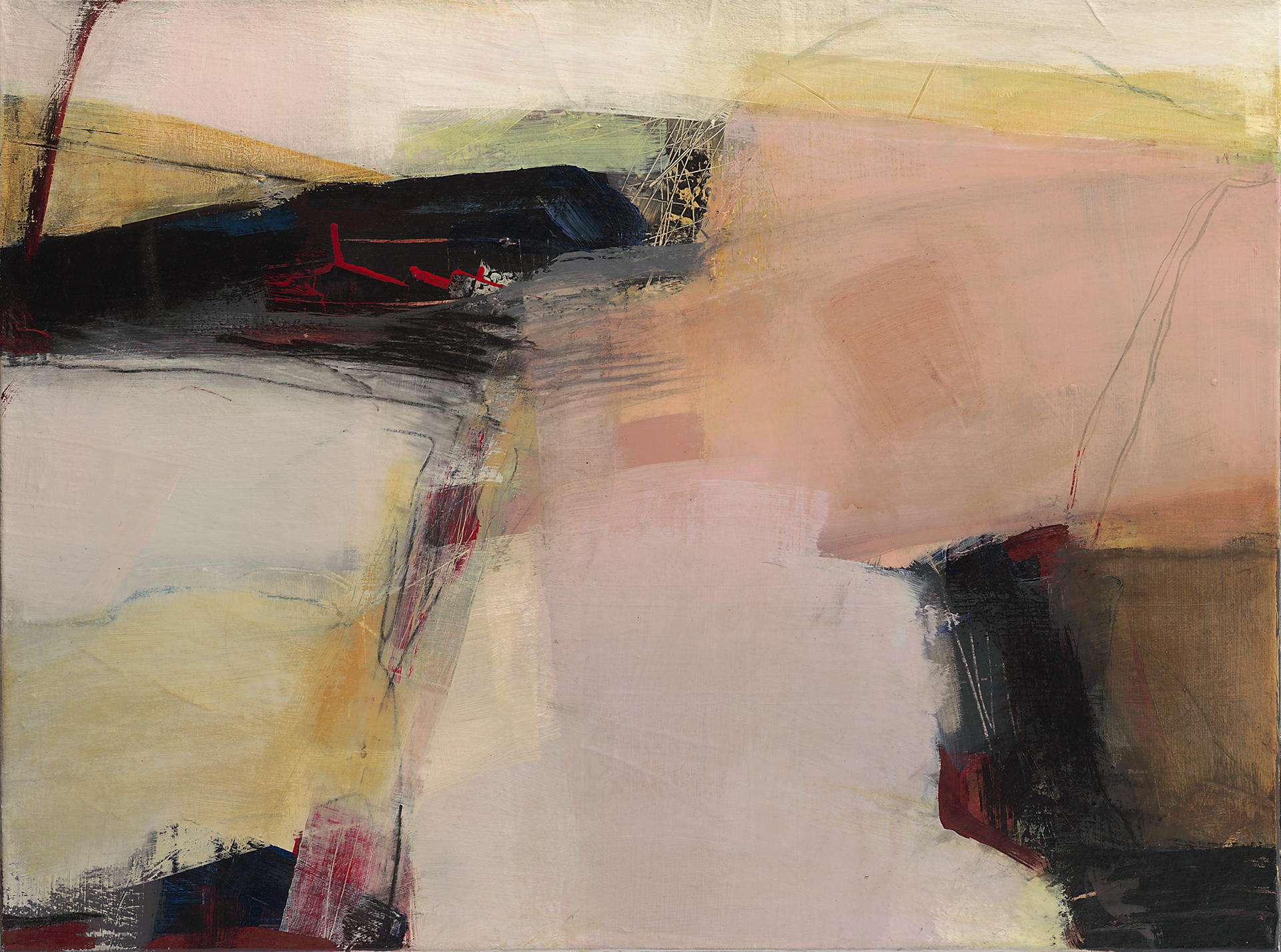 This abstract landscape evokes the pink moment that can be seen on hills and mountain tops as the sun sets. It has soft fields of color with strong dark areas for structure. 18x24 mixed media on canvas, sealed and waxed. Framed in an elegant black floater frame.