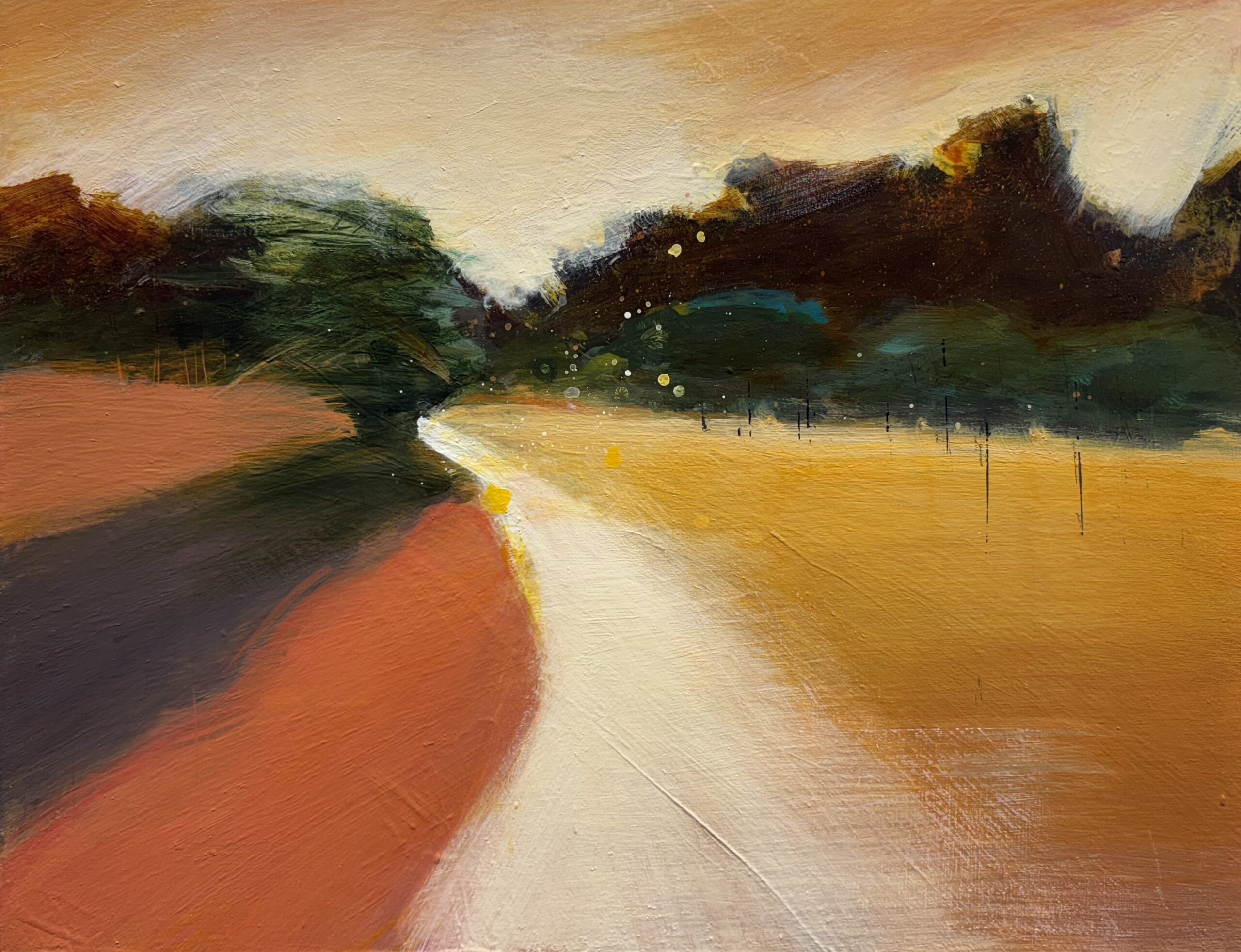 The inspiration for this night-time painting was the warm glow from the sky reflected on a meadow. I felt surrounded by liquid amber! I used mixed media on a cradled panel, and framed the piece in a light wood floater frame.