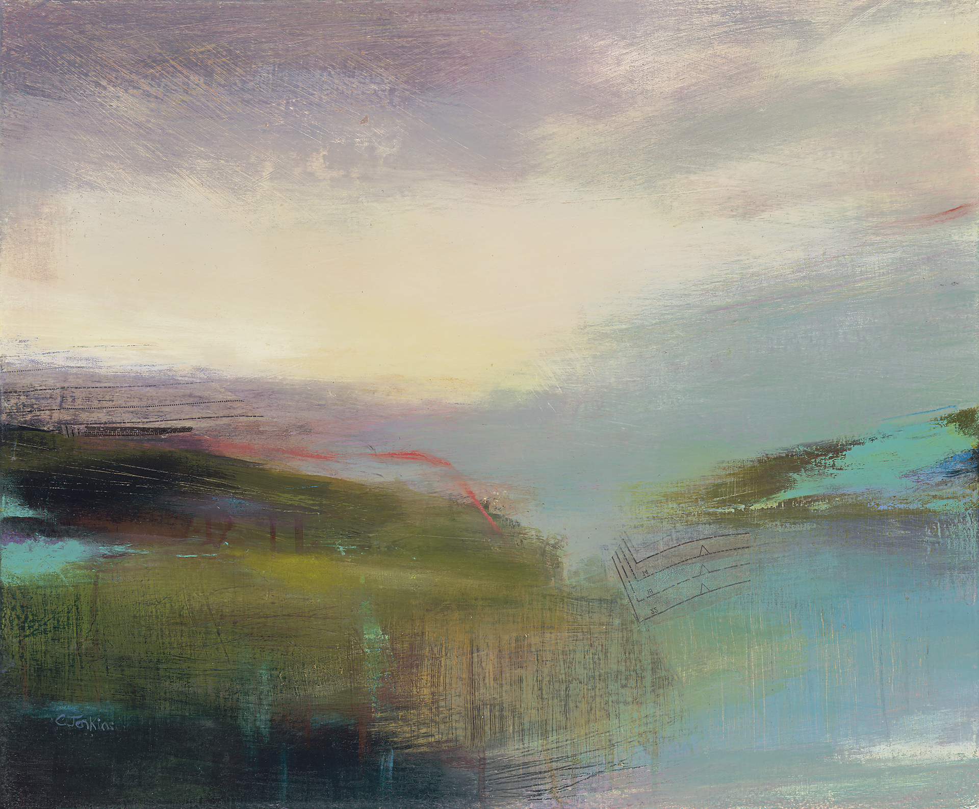 Whisper and Hush was inspired by a lyric in the Van Morrison song called Moon Dance. It conveys the mystery of a moon-lit landscape. This piece is 20x24 mixed media and oil on canvas, sealed, waxed and framed in a beautiful off-white floater frame.