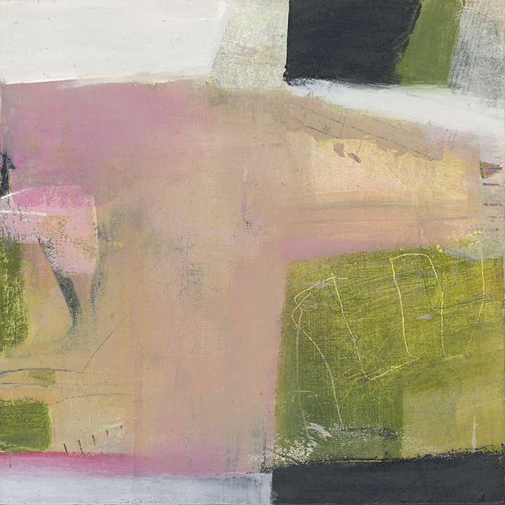 The old dress patterns used as collage, peeking through the pinks and greens of this painting evoke a wistful sense of nostalgia for times gone by. 12x12 framed mixed media on panel, sealed and waxed.