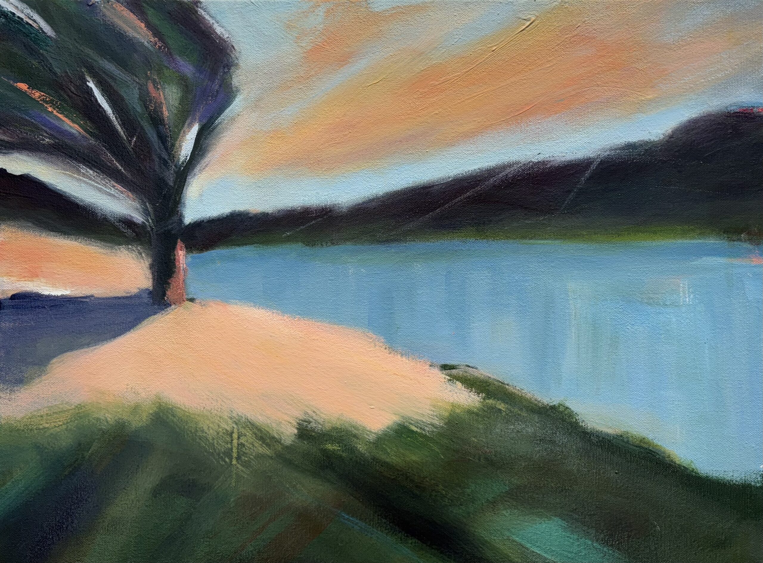 As sunset creates a salmon glow on the shore of Deadfall Lake, a lone tree stands like a sentinel facing into the coming night. This oil and mixed media landscape is framed in a simple wooden floater frame.
