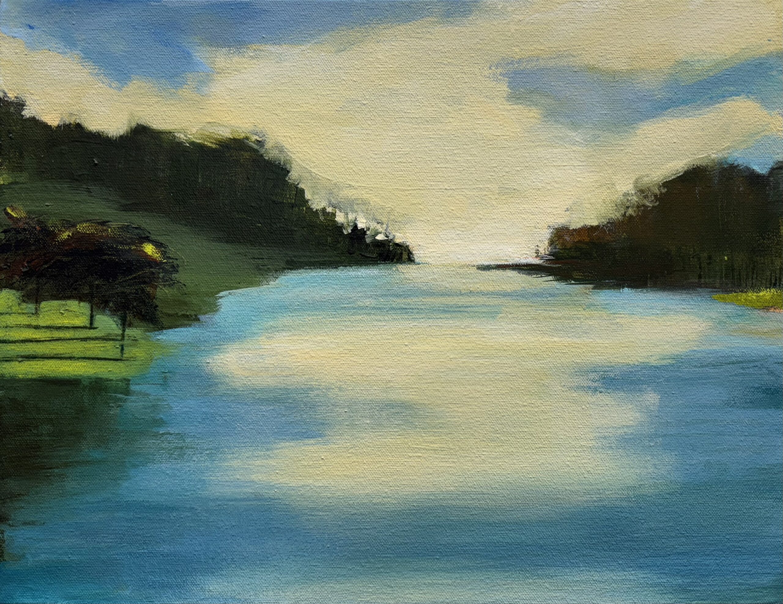 The reflection of morning light on a nearby lake reminded me of buttercream icing. This painting is acrylic and mixed media, framed in an elegant wooden floater frame.