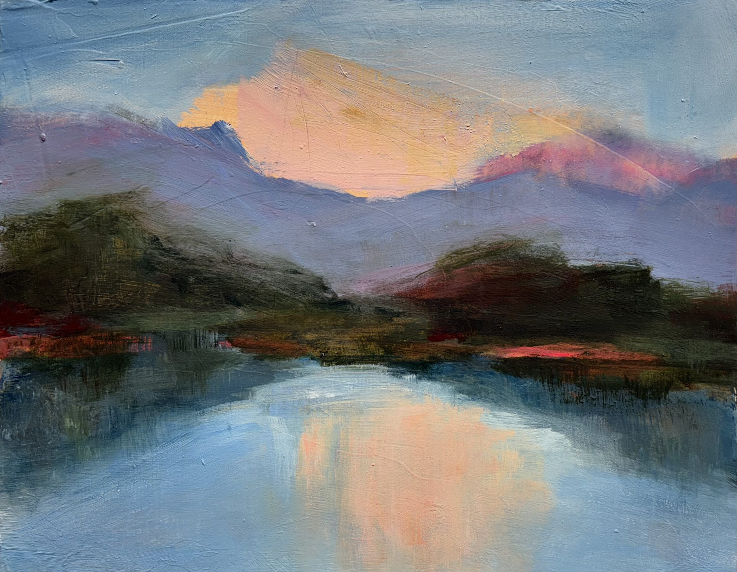When the sun sets where I live a pink and gold glow lights up the snow-covered peak of 14,000 foot Mt. Shasta. Far below that glow is reflected on Lake Siskiyou, creating a mirror of pearly light. I used mixed media on a cradled panel and framed the piece in a light wood floater frame.