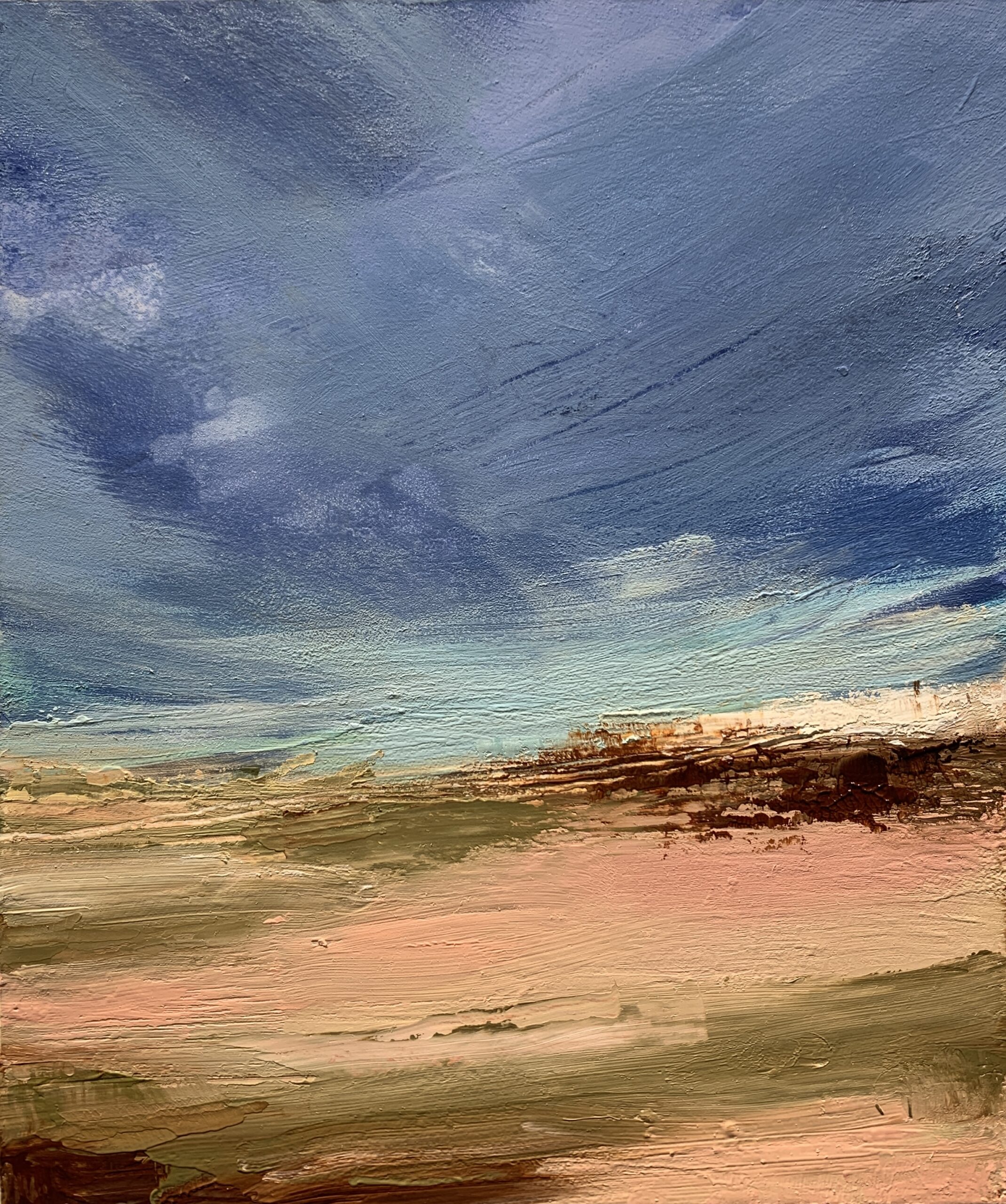 The colors in this small abstract landscape were inspired by a recent trip to Morocco, with its olive tree greens and clay tinged pinks and browns. It works well with Morocco 1! Oil paint on cradled panel.