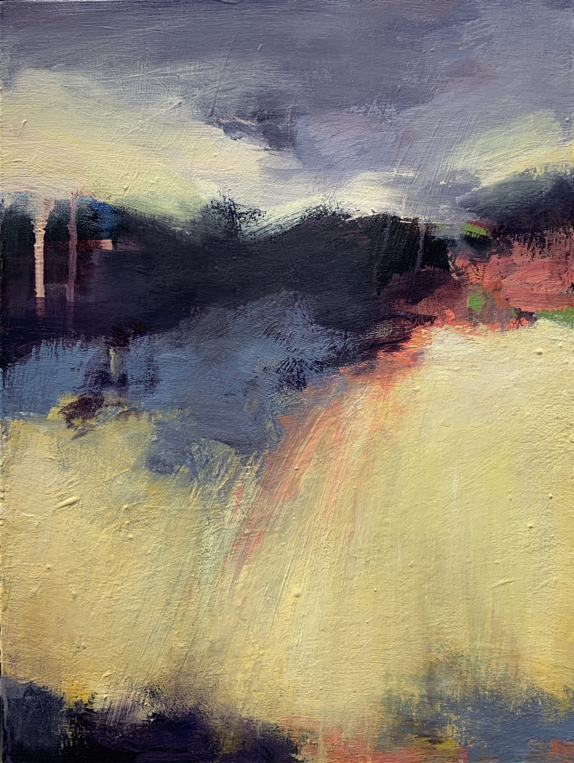 This oil & mixed media painting is about the way night falls: a parade of different colors, one after the other until darkness reins. It is framed in a white wooden floater frame.