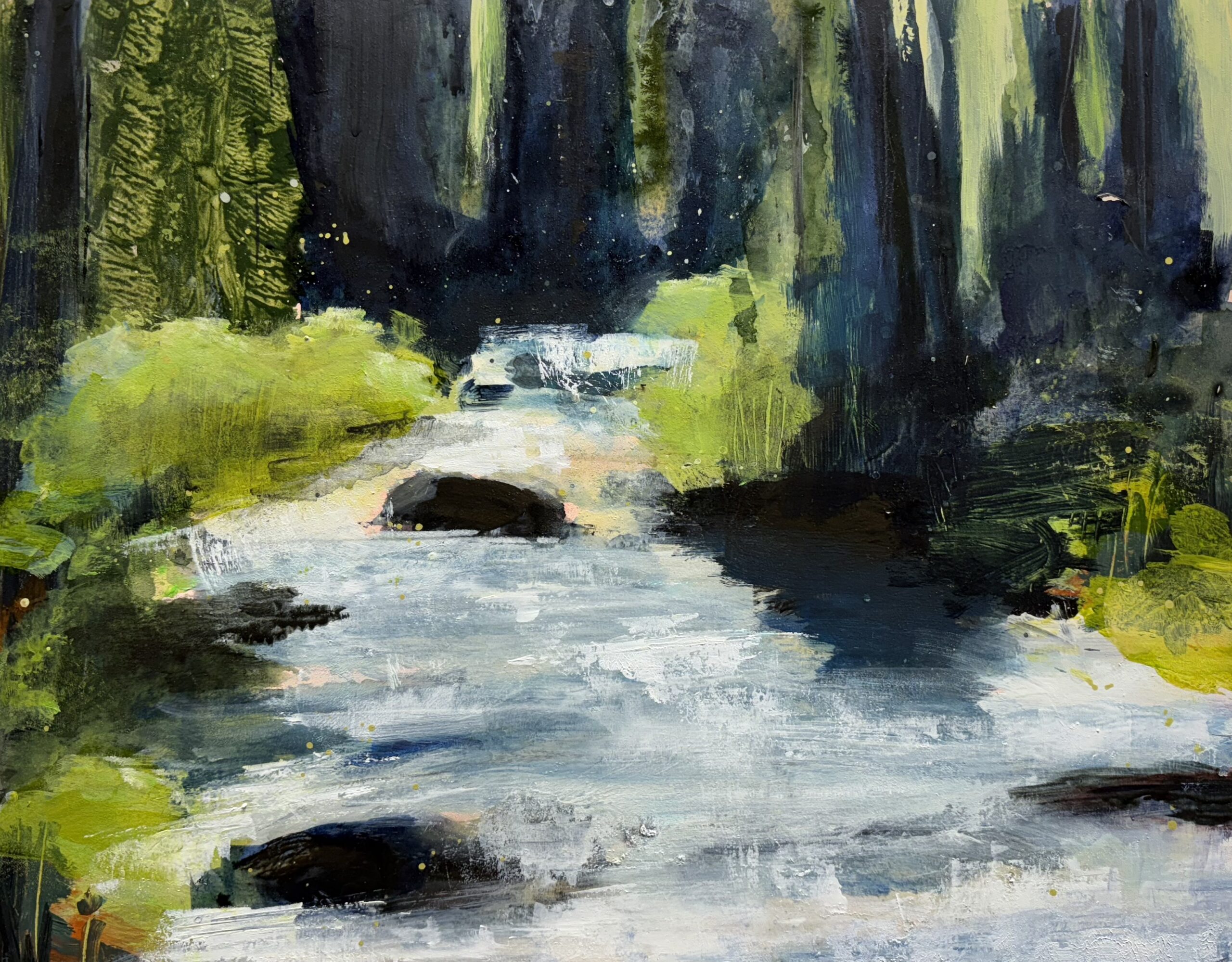 The sound of water tumbling over river rocks like a woodland chant, inspired this painting of the McCloud River in early Spring. I used mixed media on a cradled panel and framed the piece in a light wood floater frame.
