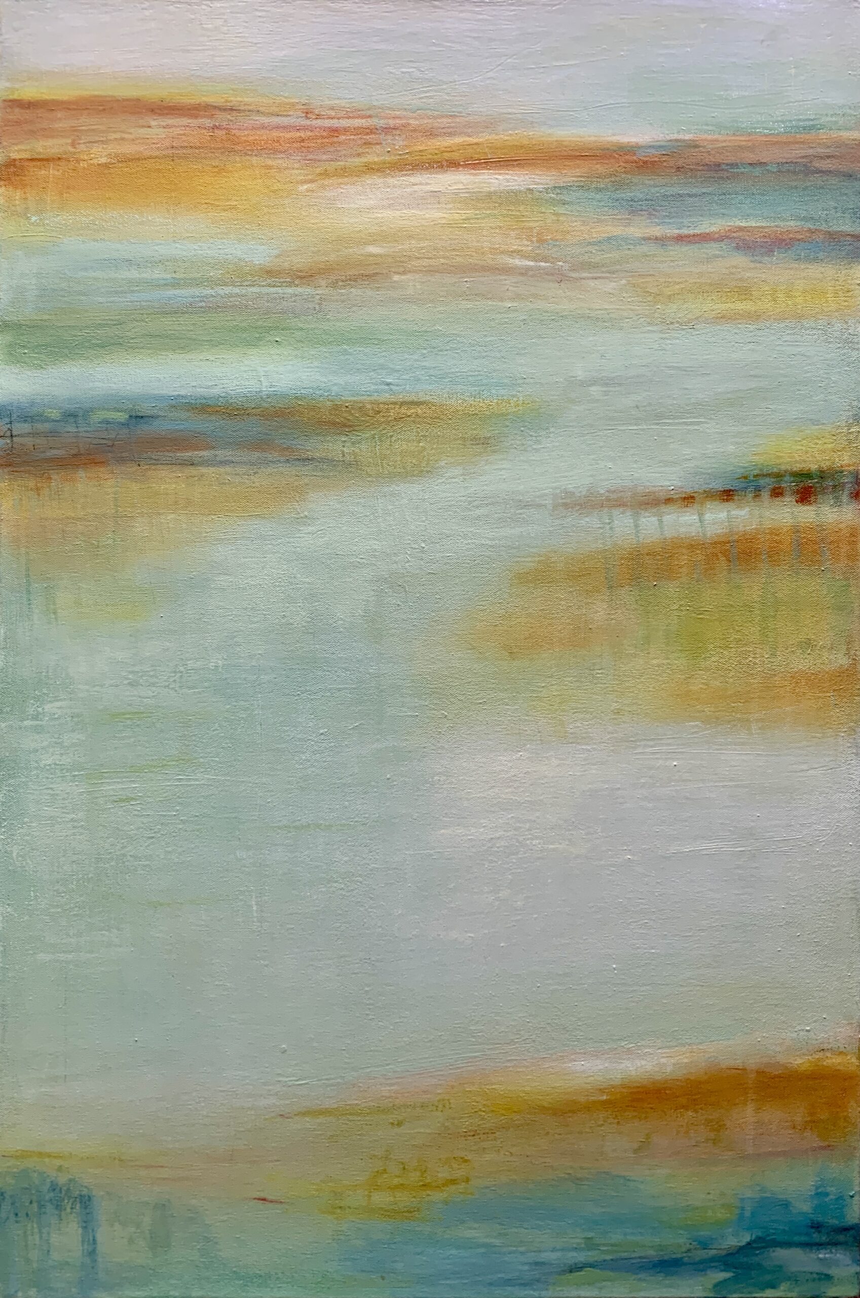 The colors of this painting remind me of shards of glass found on sandy beaches, rubbed smooth by the ocean. The piece was inspired by visits to the sea and nearby estuaries, waterways striated by all the life that thrives there. It is oil and mixed media on canvas.