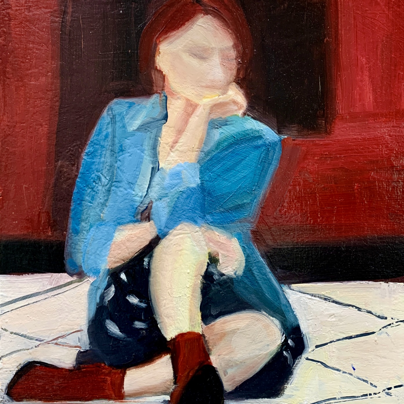 The reds in this small oil painting of a woman deep in thought are deep and passionate. The piece is framed in a simple wooden floater frame.