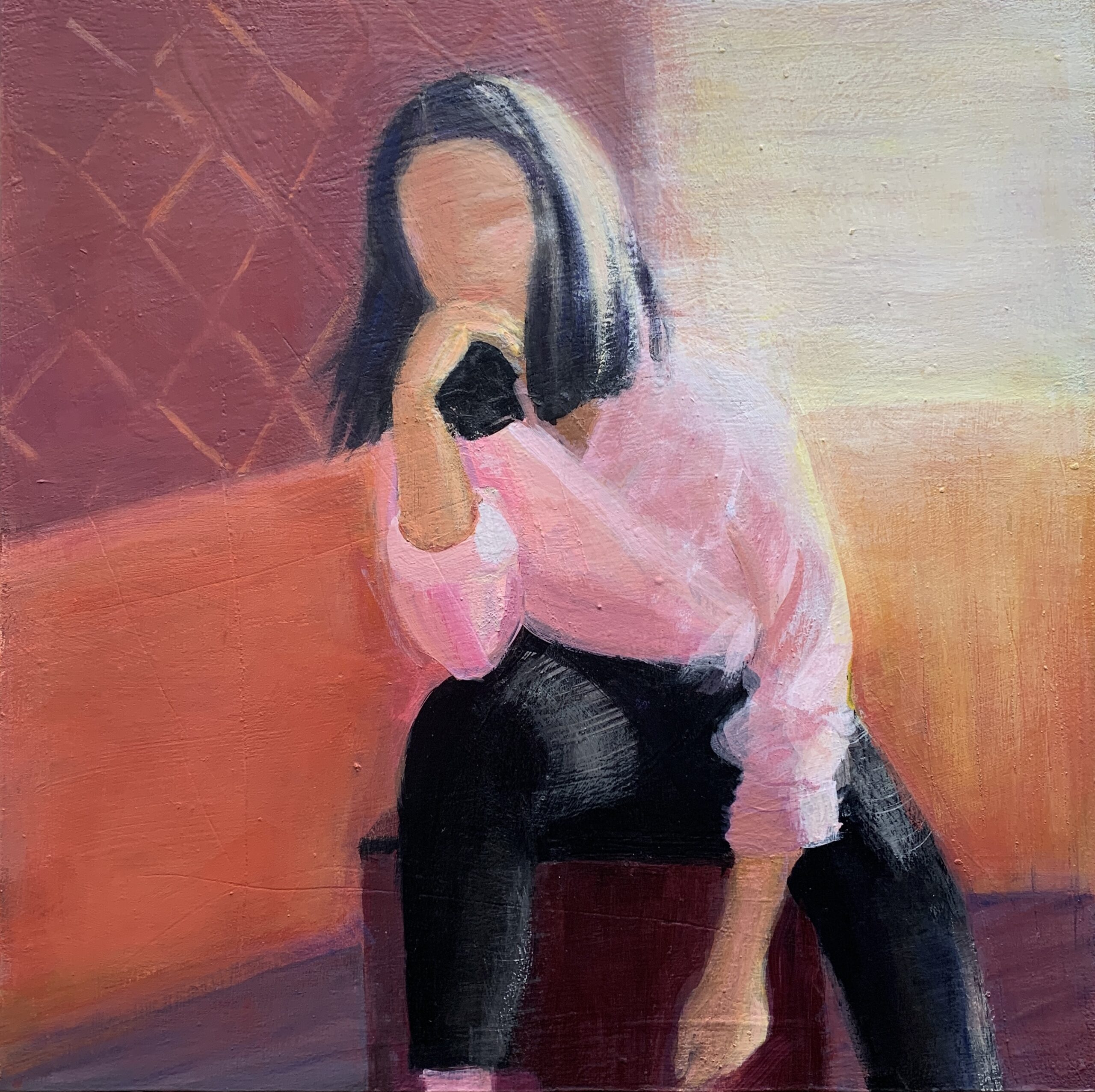 The figure in this painting is bathed in sunlight, reminding me of the warmth still possible on a bright winter day. I loved painting her pink top, blurring the boundaries of material and light. This painting is oil and mixed media on a framed panel.